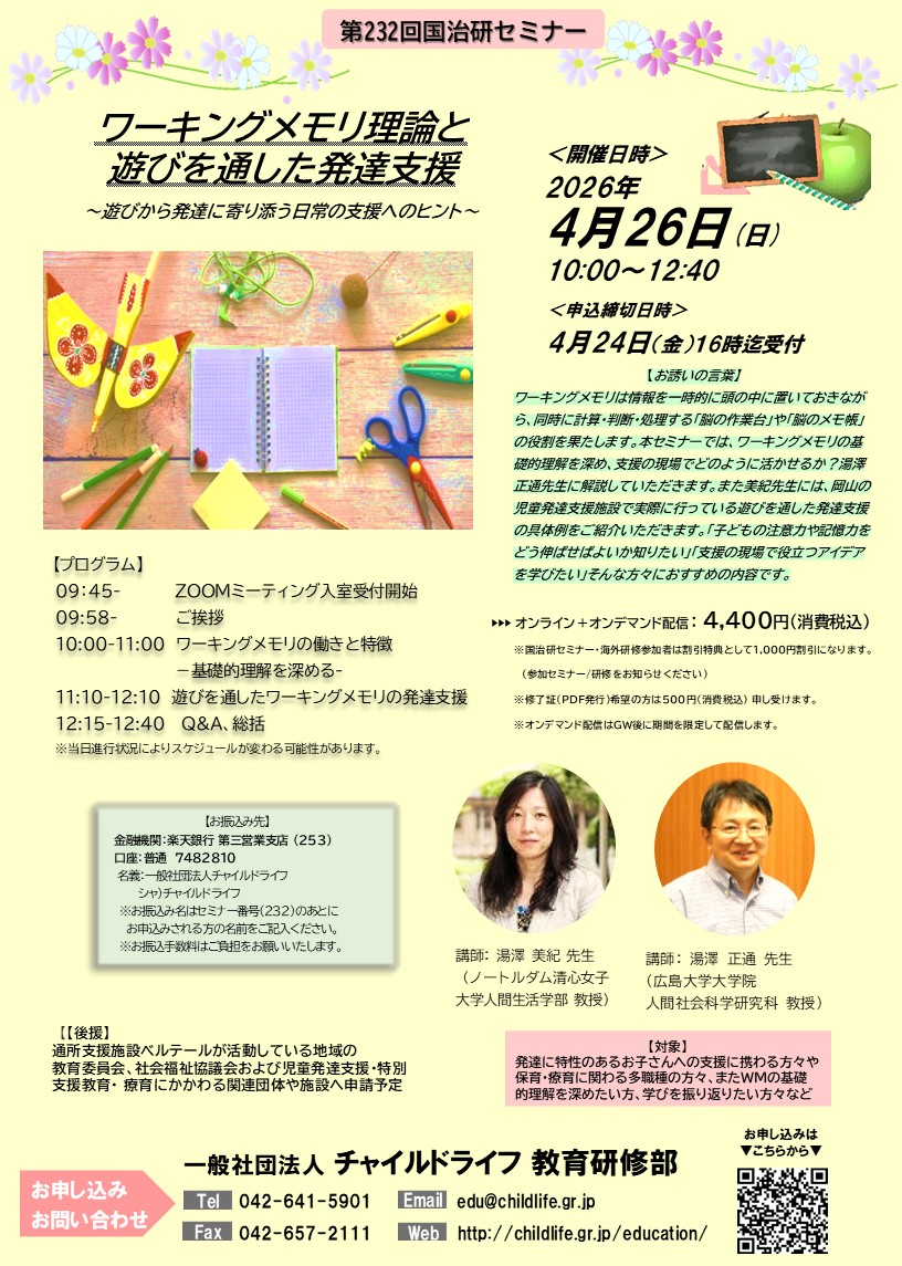 | 概要 | 【当日講師】 湯澤 正通 先生 (広島大学大学院 人間社会科学研究科 教授) 湯澤 美紀 先生 (ノートルダム清心女子大学人間生活学部 教授) 【当日プログラム】 09:45- Zoomミーティング待合室受付開始 ※開始時間の5分前までに受付をお済ませください。 09:58- ご挨拶 10:00-11:00 ワーキングメモリの働きと特徴 -基礎的理解を深める- 11:10-12:10 遊びを通したワーキングメモリの発達支援 12:15-12:40 Q&A、総括※当日進行状況によりスケジュールが変わる可能性があります。 |