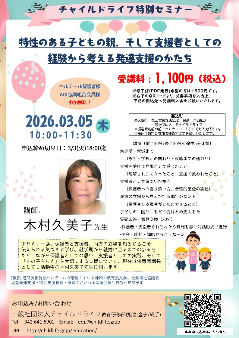 チャイルドライフ特別セミナー 特性のある子どもの親、そして支援者としての経験から考える発達支援のかたち