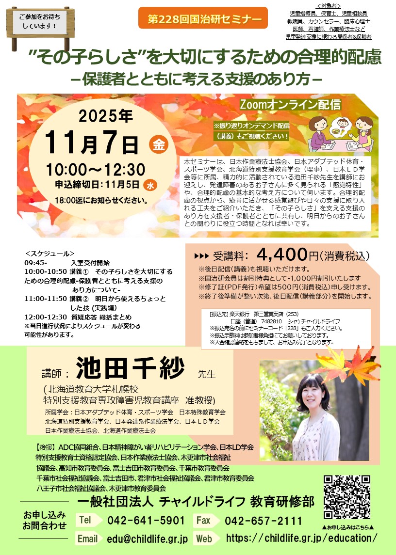 池田千紗 先生本セミナーは、日本作業療法士協会、日本アダプテッド体育・スポーツ学会、北海道特別支援教育学会(理事)、日本LD学会等に所属、精力的に活動されている池田千紗先生を講師にお迎えし、発達障害のあるお子さんに多く見られる「感覚特性」や、合理的配慮の基本的な考え方について伺います。その子らしさを大切にするための合理的配慮-保護者とともに考える支援のあり方について、また明日から使えるちょっとした技についても解説していただきます。