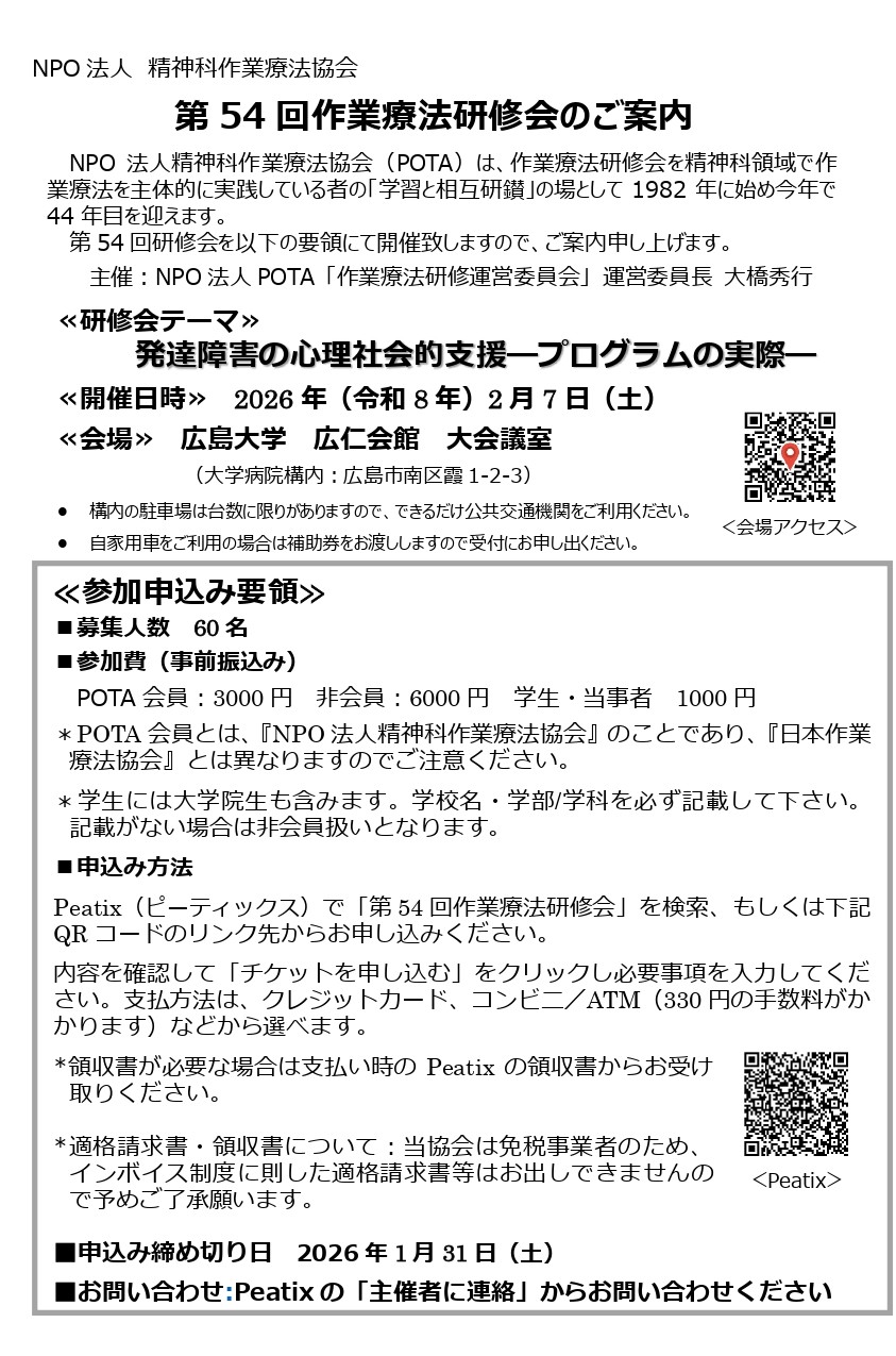| 参加費 | (事前振込み) POTA会員:3000円 非会員:6000円 学生・当事者 1000円 |